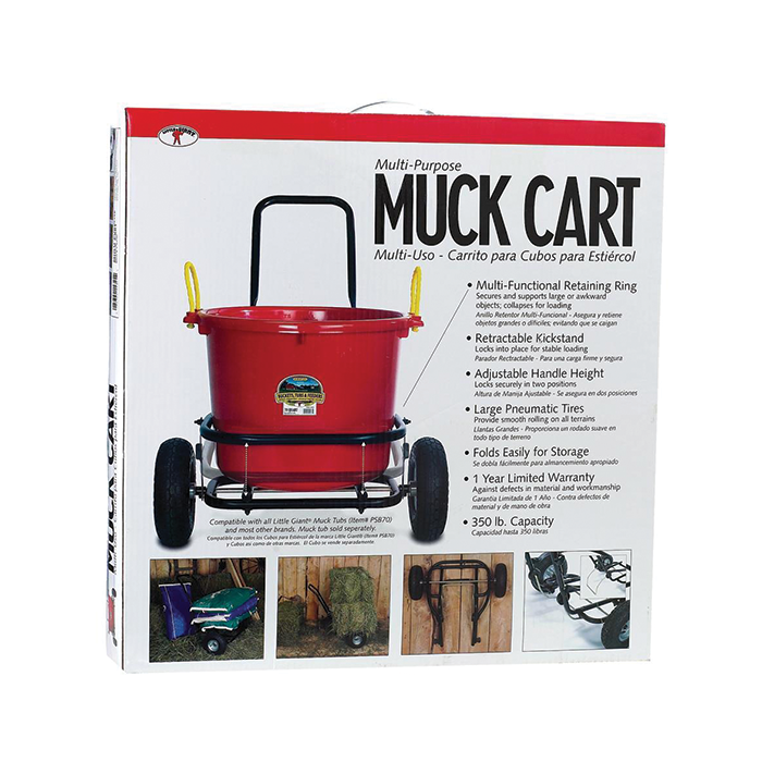 You can't even think of all the uses you'll find for this little workhorse! It's designed to hold a standard 70-Quart Muck Tub (not included), but handily doubles as a pneumatic two-wheeler for moving feed sacks, square bales, garbage cans, or any you-name-it cargo up to 350 pounds. The drop-down retaining ring securely holds a Muck Tub or other containers in place, and easily collapses for loading full, heavy, or large items. Large pneumatic tires allow the cart to maneuver over almost any terrain, indoors or outdoors. The retractable kickstand holds the cart in place for stable loading and unloading. Adjustable handle locks securely at two heights. It easily folds for storage or for carrying along in a trailer or vehicle. A lifesaver for farm and ranch.