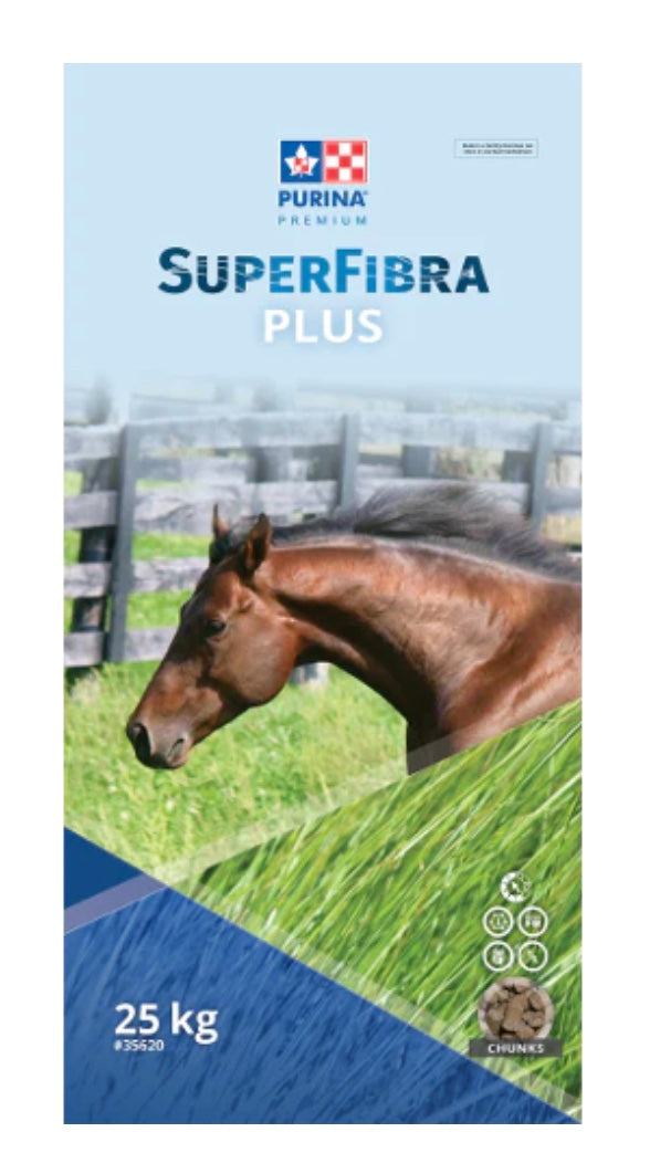 SuperFibra Plus is a versatile feed low in sugar/starch (NSC - nonstructural carbohydrates) in a chunk format. SuperFibra Plus is a complete feed designed to meet the needs of maintenance, exercising, breeding horses and yearlings that require a low sugar/starch diet.