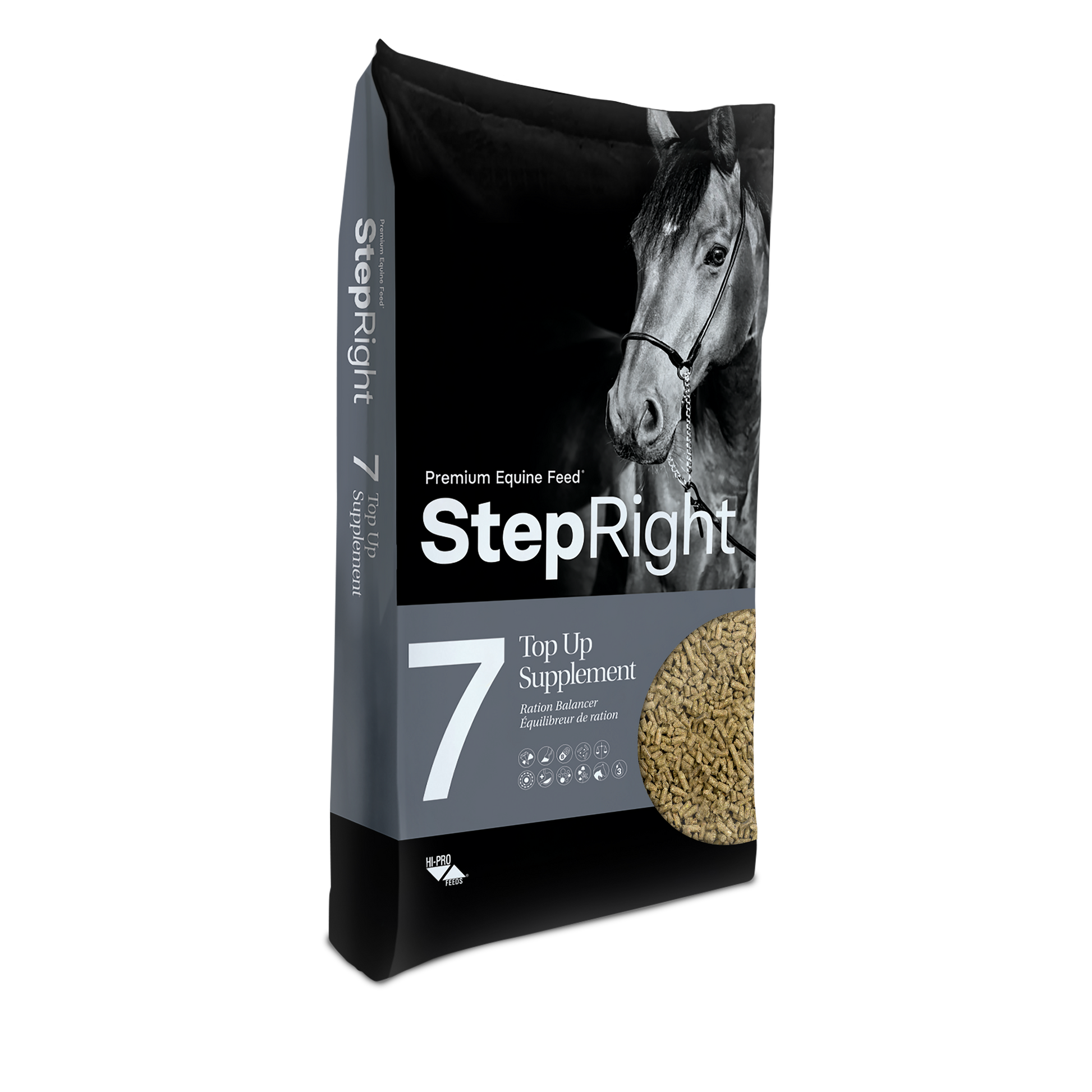 Step 7 -Top Up Supplement – Ration Balancer is a low inclusion balancer for horses consuming non-complete feeds such as oats or COB (corn, oats, barley), or for topping up your horses’ nutritional program. It is also suitable for horses on pasture, over-conditioned horses and for horses with low energy requirements.